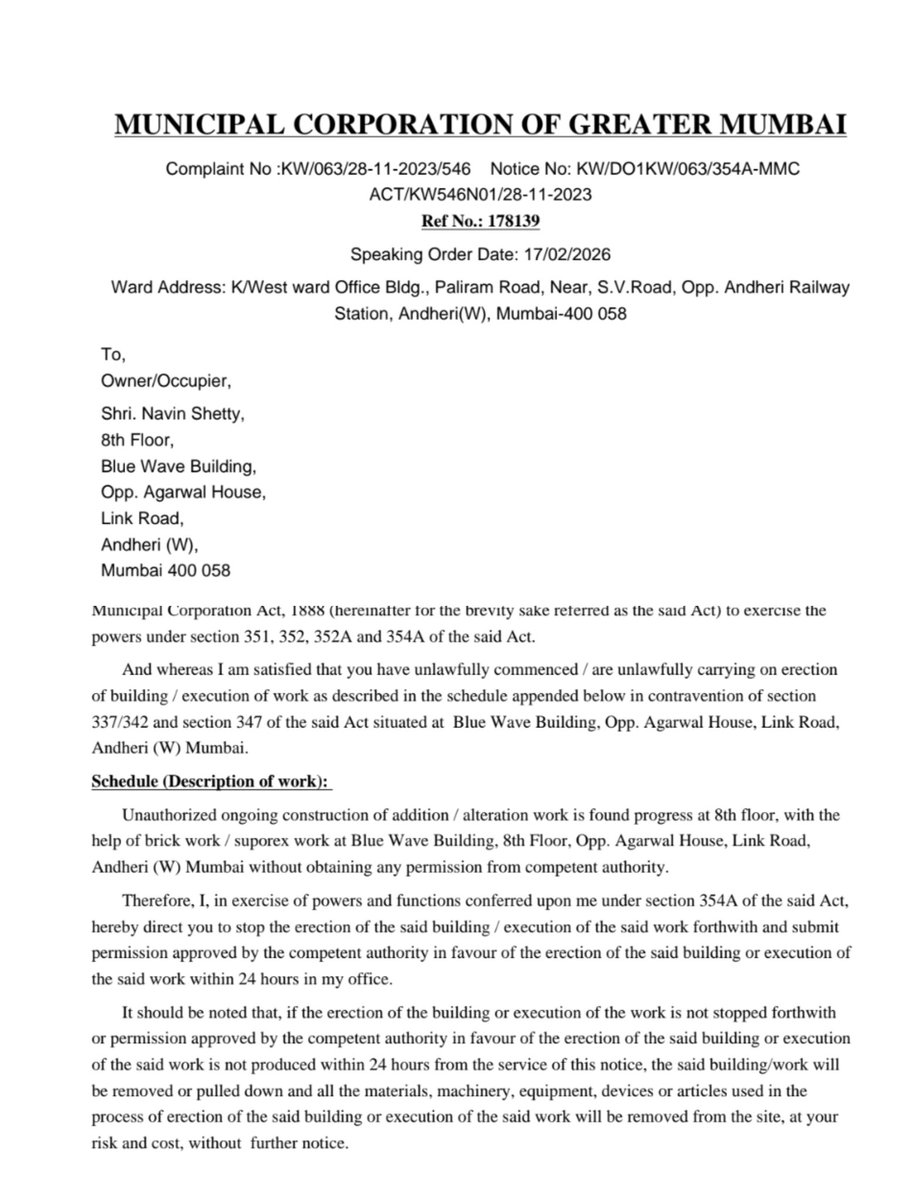 के/वेस्ट मनपा बिट क्र.63, इ व का खात्यातील दु.अभि.श्री. आदित्य पाटिल यांनी अवैध बांधकामांच्या कारवाईबाबत AMC श्री.डॉ.विपिन शर्मा यांना दिला खोटा अहवाल, D.M.C Zone-4,व A.C. K/West, यांची केली दिशाभूल, आठव्या मजल्यावरील अवैध मोठ्या बांधकामास नोटीस बजावून दिले संरक्षण, @mybmcwardKW