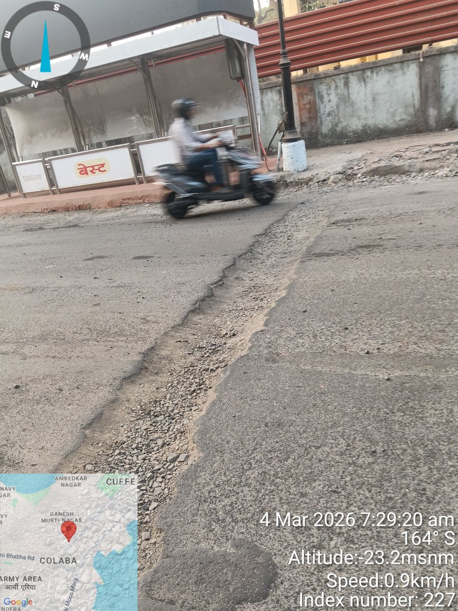 डॉ होमी भाभा रोड नेवी नगर कोलाबा मुंबई 5 धोबी घाट बस स्टॉप यहां पर 30 दिन से मैंन रोड को डैमेज करके इलेक्ट्रिक वायर बस स्टॉप के लिए डाला गया उसके बाद रोड को रिपेयर नहीं किए गया जिसके कारण यहां पर एक्सीडेंट हो रहे हैं @myBESTBus @mybmc @mybmcWardA @MTPHereToHelp