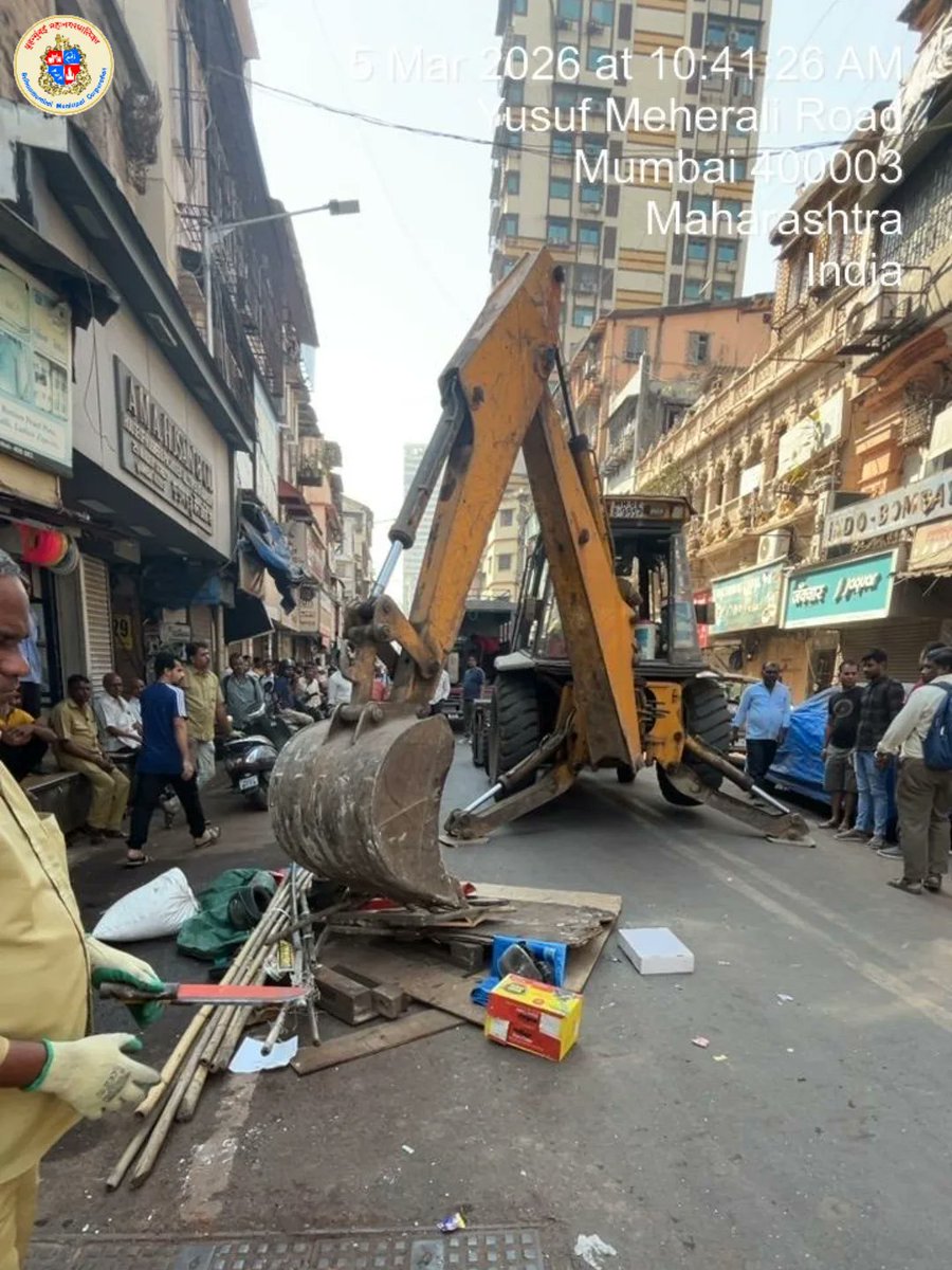 बृहन्मुंबई महानगरपालिकेच्या ‘बी’ विभागाच्या वतीने नागदेवी मार्ग परिसरात आज अनधिकृत बांधकामांवर निष्कासनाची कारवाई करण्यात आली. सहायक आयुक्त (बी विभाग) श्री. योगेश देसाई यांच्या नेतृत्वात करण्यात आलेल्या या कारवाईदरम्यान संबंधित विभागांचे अधिकारी व कर्मचारी उपस्थित होते.