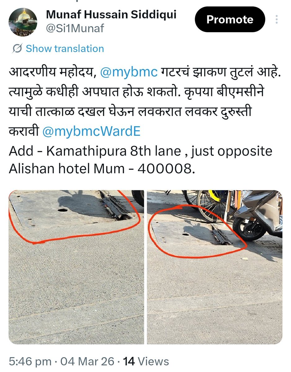आदरणीय महोदय, @mayor_mumbai @mybmc @mybmcWardE @TawdeRitu ४ तास झाले तरी BMC कडून अजून कोणताही प्रतिसाद आलेला नाही. आधी तक्रार केल्यावर BMC लवकर उत्तर देत होती, पण आता तक्रारींवर त्वरित प्रतिसाद मिळत नाही.
