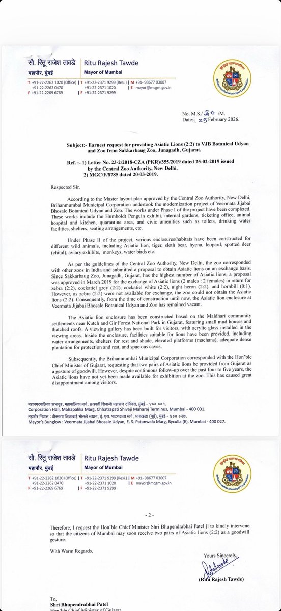 Mumbai Mayor Ritu Tawde writes to Gujarat Chief Minister Bhupendra Patel seeking two pairs of Asiatic Lions as a goodwill gesture from Sakkarbaugh zoo in Junagadh.