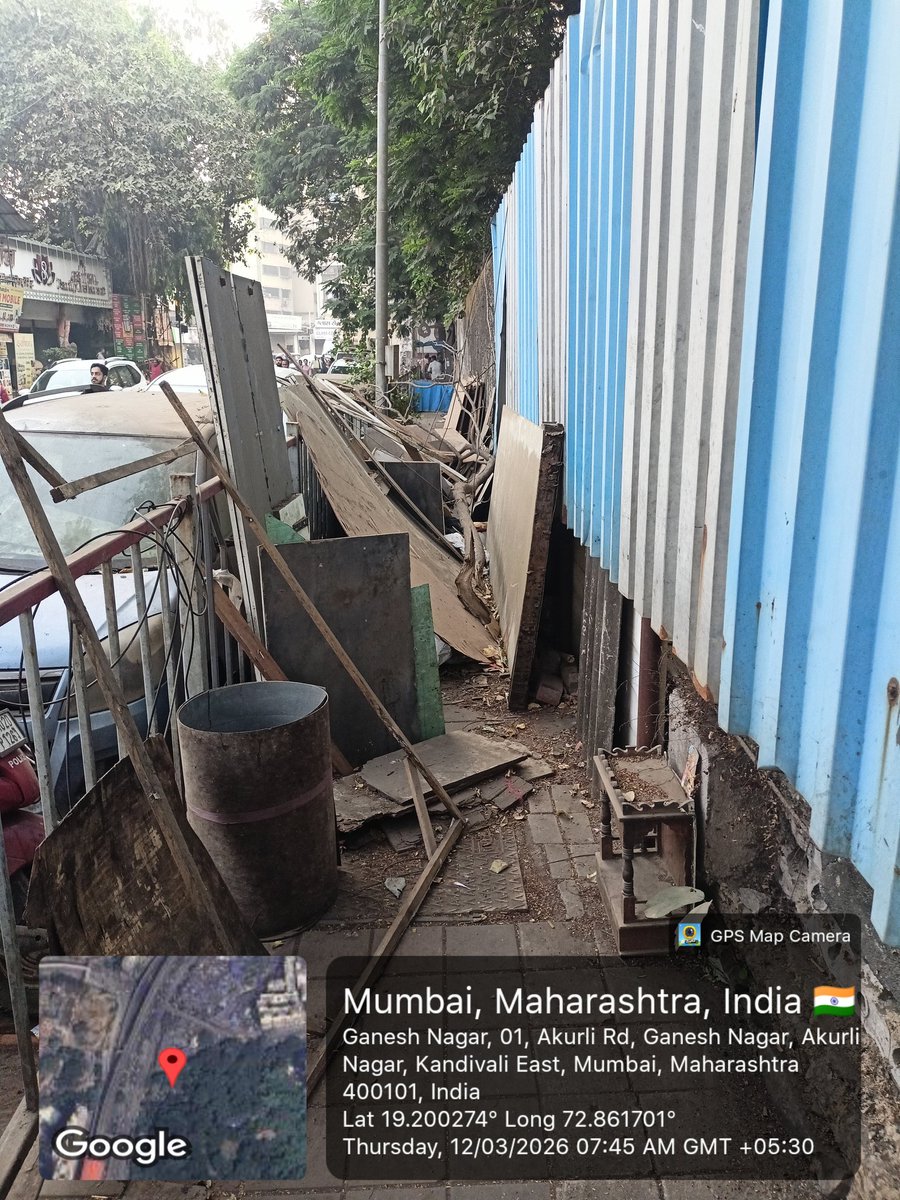 @CMOMaharashtra @AlertCitizen6 @BhatkhalkarA @mybmc @mybmcWardRS @CPMumbaiPolice @SamtaNagarPS @DGPMaharashtra स्थळ - सहाय्यक आयुक्त समता नगर पोलीस ठाणे व पासपोर्ट कार्यालय यांच्या गेट बाहेरील फुटपाथ १२ मार्च ला तक्रार करुनही अजून मोकळा केलेला नाही.आर/दक्षिण मनपा चा बेजबाबदारपणा
