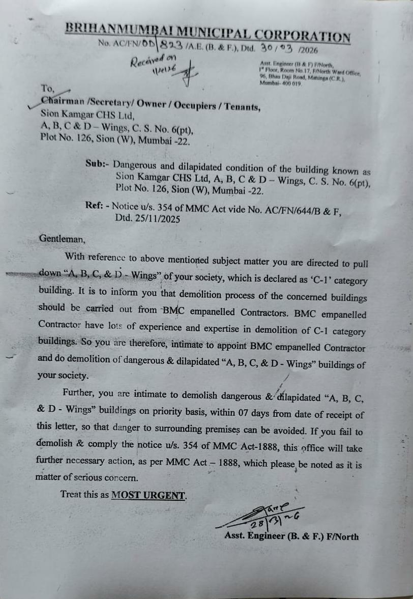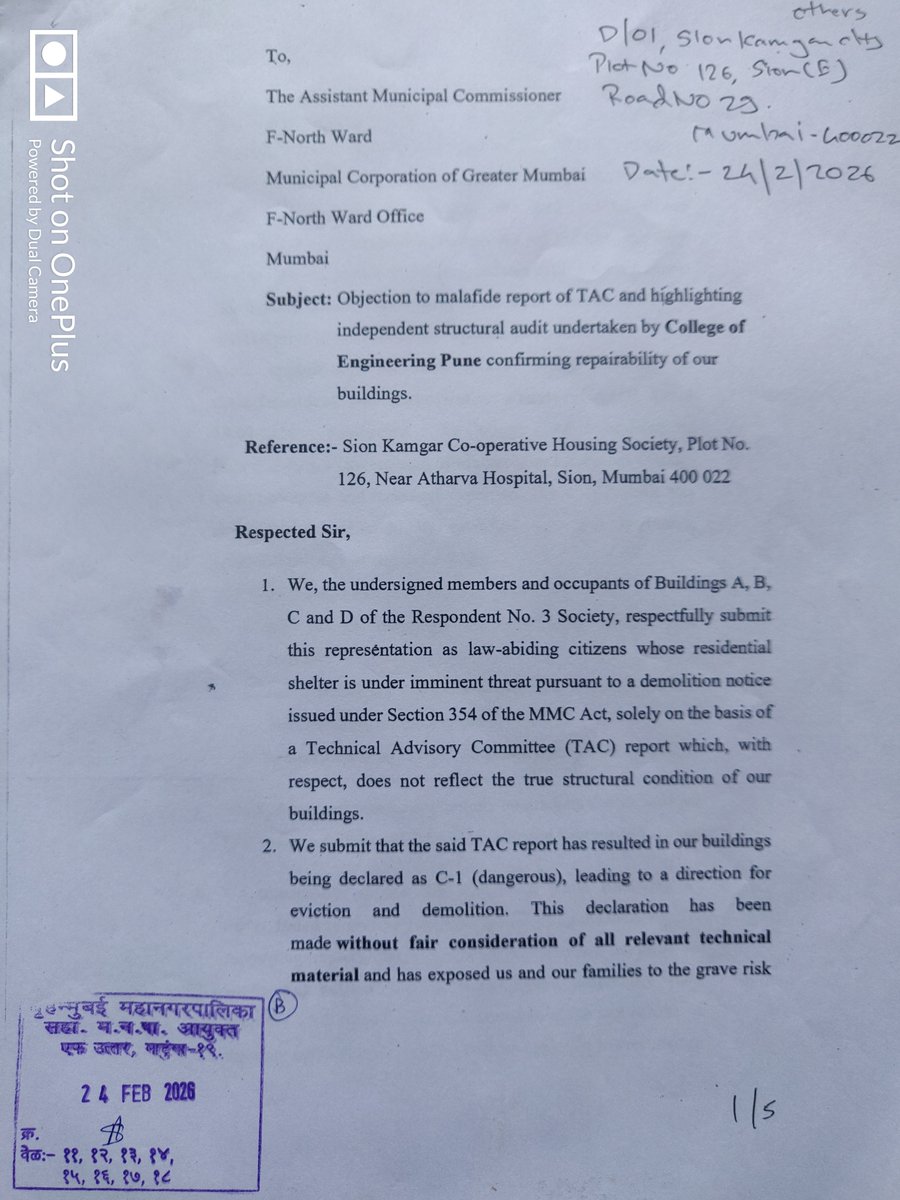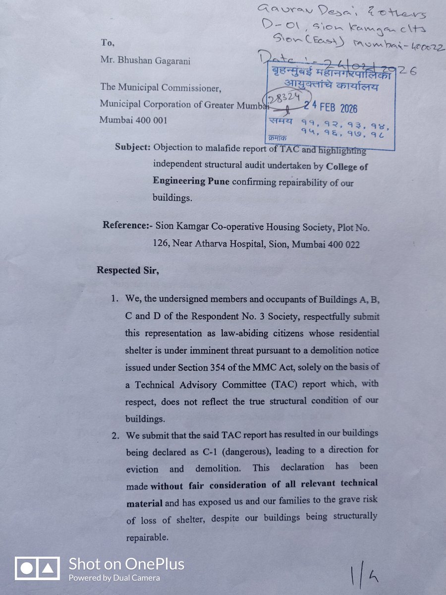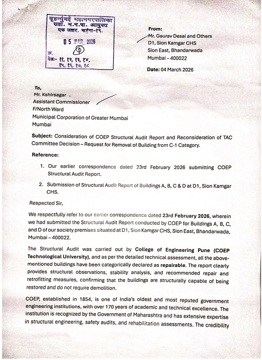 @mybmcWardFN @mybmc Urgent ! Inspite of submitting letter to consider COEP Audit Report why we are still getting intimation letter from BMC to demolish our society buildings? PFAdocs,CC : @AshwiniBhide @RajeshreeAtWork @TawdeRitu @CMOMaharashtra @Dev_Fadnavis @PMOIndia @AmitShah