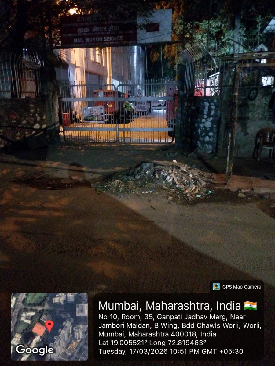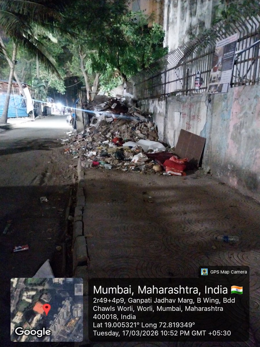 वरळीतील गणपत जाधव मार्गावरील पोस्ट ऑफिस गॅरेज च्या गेट समोर आणि मागील बाजूस असणाऱ्या फूटपाथवर डेब्रिज टाकण्यात आले.@mybmc @mybmcWardGS