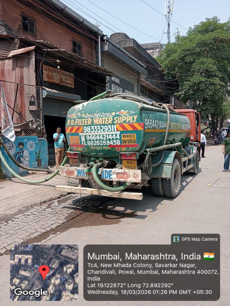 एल अँड टी एमरल्ड समोर साकी विहार रोड वर भरदिवसा टँकरद्वारे बेकायदेशीर पाण्याचा व्यवसाय सुरू आहे!कोणतीही अधिकृत परवानगी नसताना पाण्याची उघड विक्री होत असून लाखो रुपयांचा महसूल बुडत आहे. हे नेमकं कोणाच्या आशीर्वादाने सुरू आहे? कारवाई करून संबंधितांवर गुन्हा दाखल करावा. @mybmcWardL