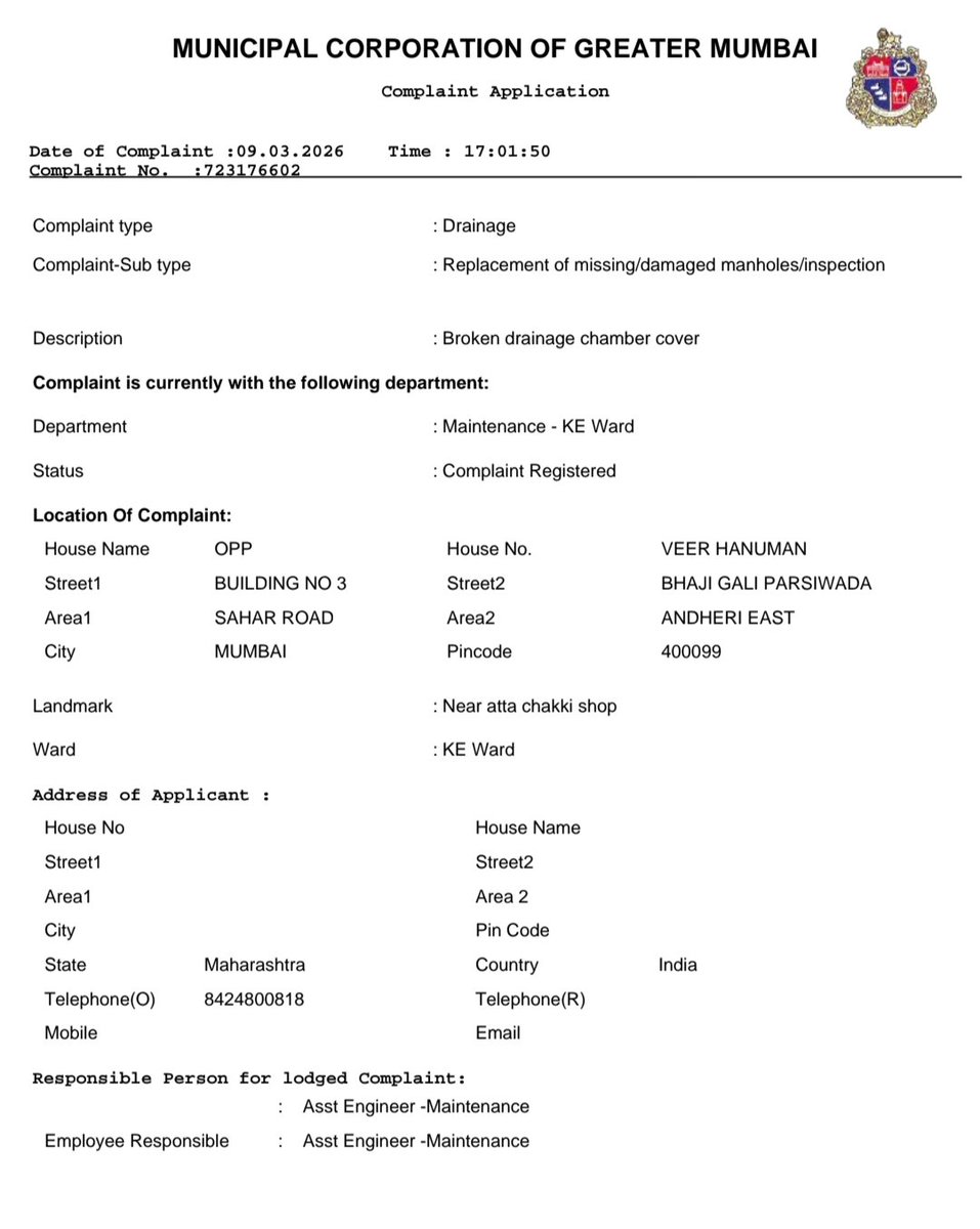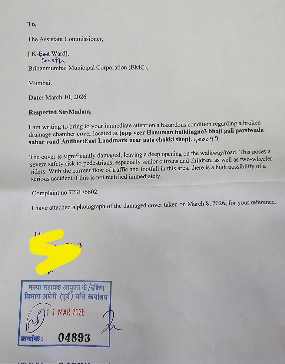 @mybmcWardKE drainage chamber cover broken kindly help to replace it Already written complaint submitted to Ksouth ward( Keast)kindly wake up Complaint no 723176602 Location: opp veer Hanuman building no 3 bhaji gali parsiwada sahar road Andheri East near atta chakki shop