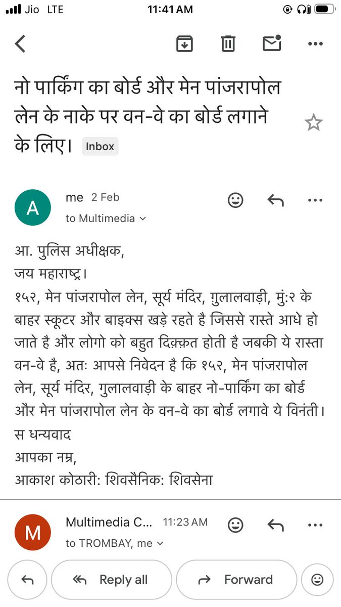 @MTPHereToHelp @mybmc @MumbaiPolice जय महाराष्ट्र, १५२, मेन पांजरापोल लेन, सूर्य मंदिर, गुलालवाड़ी, दक्षिण मुंबई:२ के बाहर नो पार्किंग का बोर्ड और मेन पांजरापोल लेन के बाहर वन वे का बोर्ड लगावे ये विनंती। स धन्यवाद आकाश कोठारी शिवसैनिक: शिवसेना