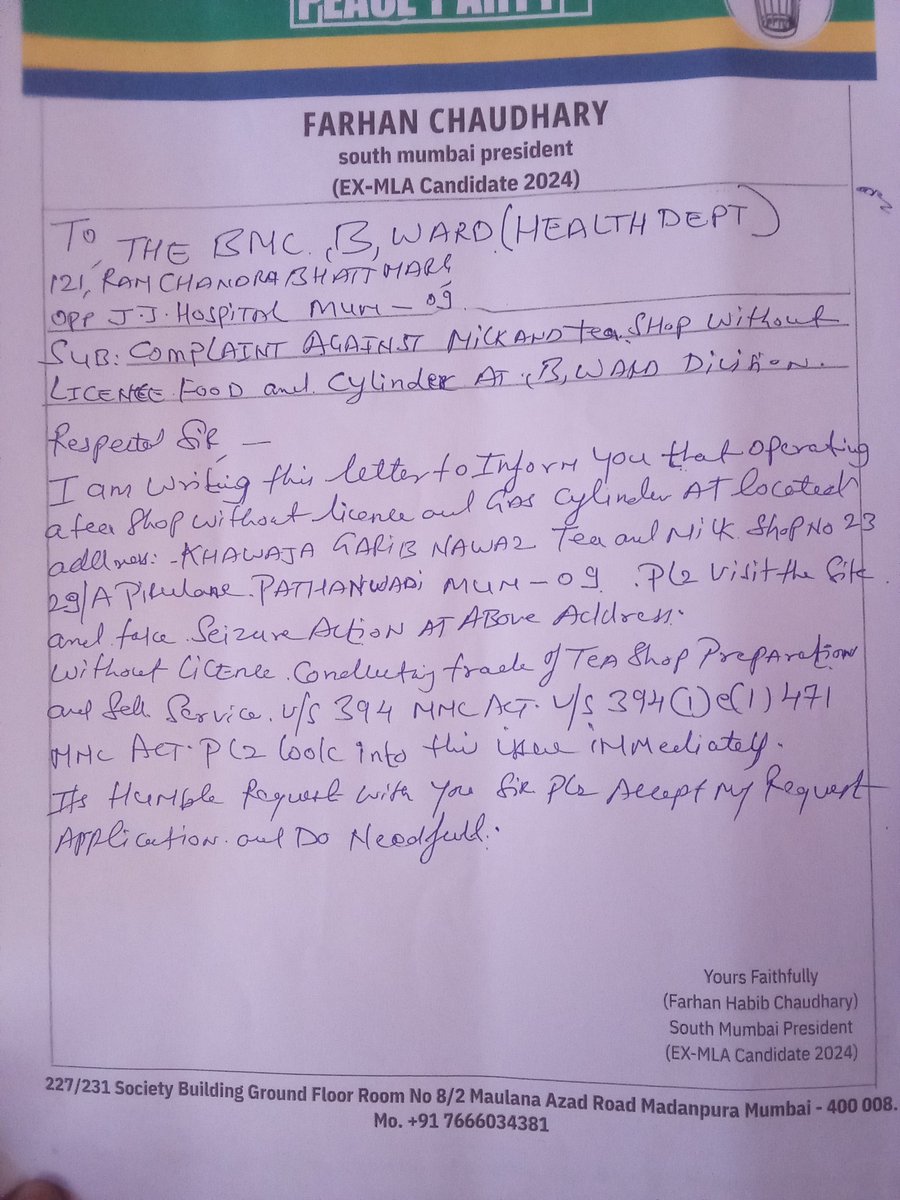 @mybmc @mybmcWardB @mybmcHealthDept ATTN .COMPLAINT AGAINST TEA SHOP WITHOUT LICENSE CONDUCTING TRADE OF TEA ..AT B WARD DIVISION.... MUMBAI 09...29/A PIRU LANE PATHAN WADI KHAWAJA GARIB NAWAZ TEA AND MILK SHOP NO 23, MUMBAI 09 MCGM POLICY MMC ACT SECTION 394(1)e(1)471.