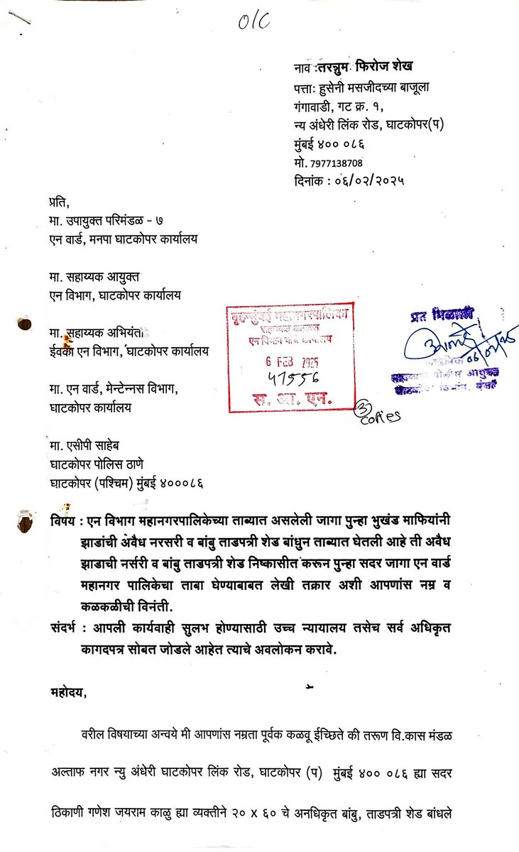 @mybmcWardN "कौतुक आहे! @mybmc घाटकोपर 'एन' विभागात भूखंड माफिया सुसाट आणि अधिकारी गाढ झोपेत! ६ फेब २०२५ ची तक्रार (क्र. ४७५५६) आणि २०१७ ची कोर्ट ऑर्डर असूनही १ वर्ष कारवाई का नाही? महापौर ऋतू तावडे मॅडम, माफियांसमोर प्रशासन झुकले आहे का? तक्रारदार: फिरोज शेख 9920266601