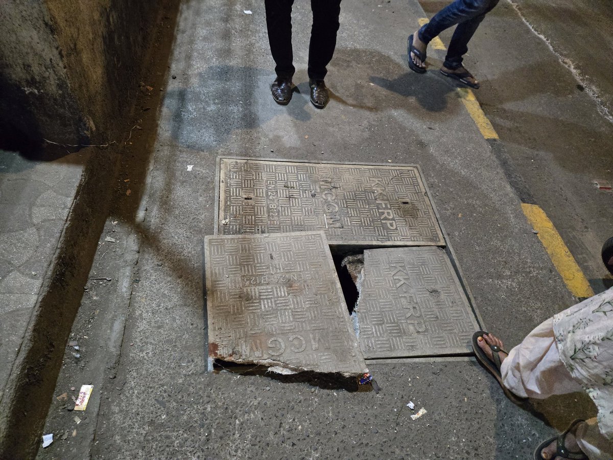 So yeah I just fell in a manhole near CCD, right in front of the Rambaug turn. Thanks @mybmc. I guess I should thank my stars I didn't fall in completely.