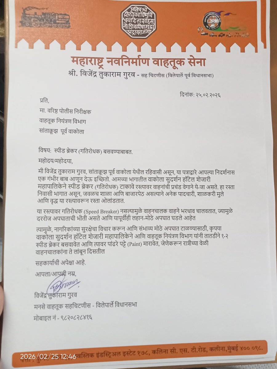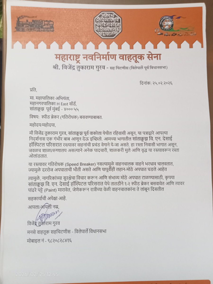 वाकोला सुदर्शन हॉटेल शेजारी महापालिकेने स्पीड ब्रेकर टाकावे कारण त्याजागी शाळेतील मुले आणि वरिष्ठ नागरिक ये-जा करतात आणि त्यातील काही लोकांचा स्पीड ब्रेकर नसल्यामुळे टूव्हीलर आणि फोर व्हीलरची धडक लागून अपघात झाले आहेत त्वरित स्पीड ब्रेकर लावावे @MTPHereToHelp @mybmcWardHE @mybmc