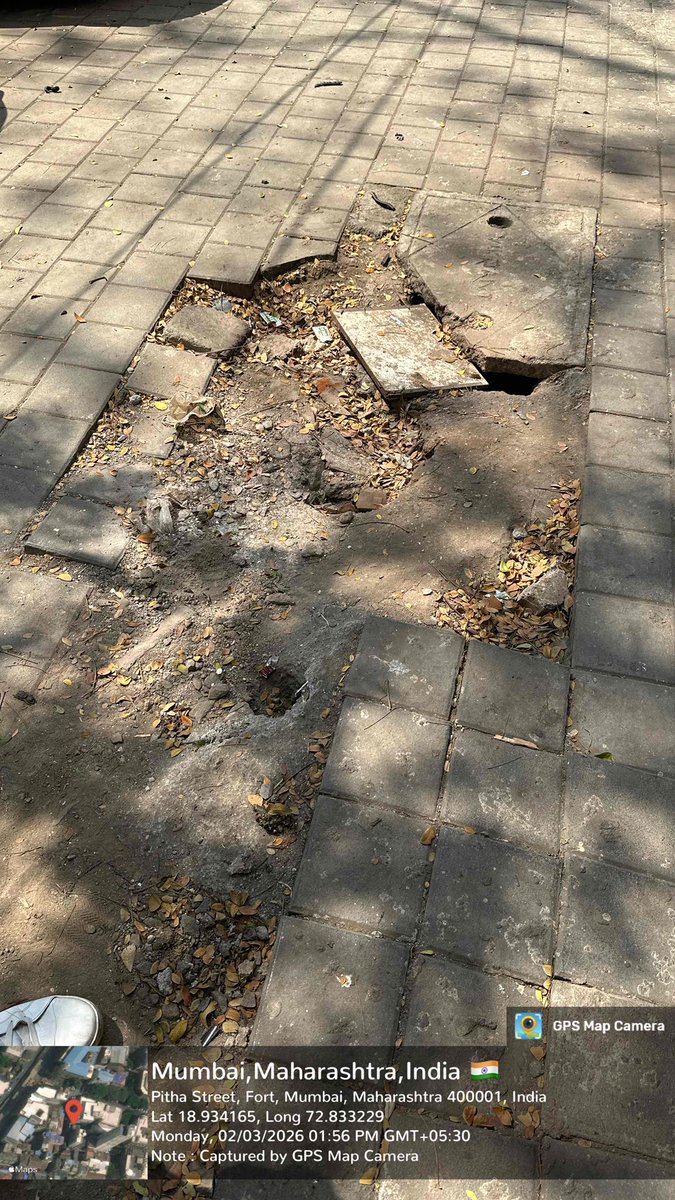 @mybmc This footpath needs repair and clean up. It is not walkable and and full of dust debris and garbage. United India Insurance Mumbai, Maharashtra, India Pitha Street, Fort, Mumbai, Maharashtra 400001, India Lat 18.934165, Long 72.833229 Monday, 02/03/2026