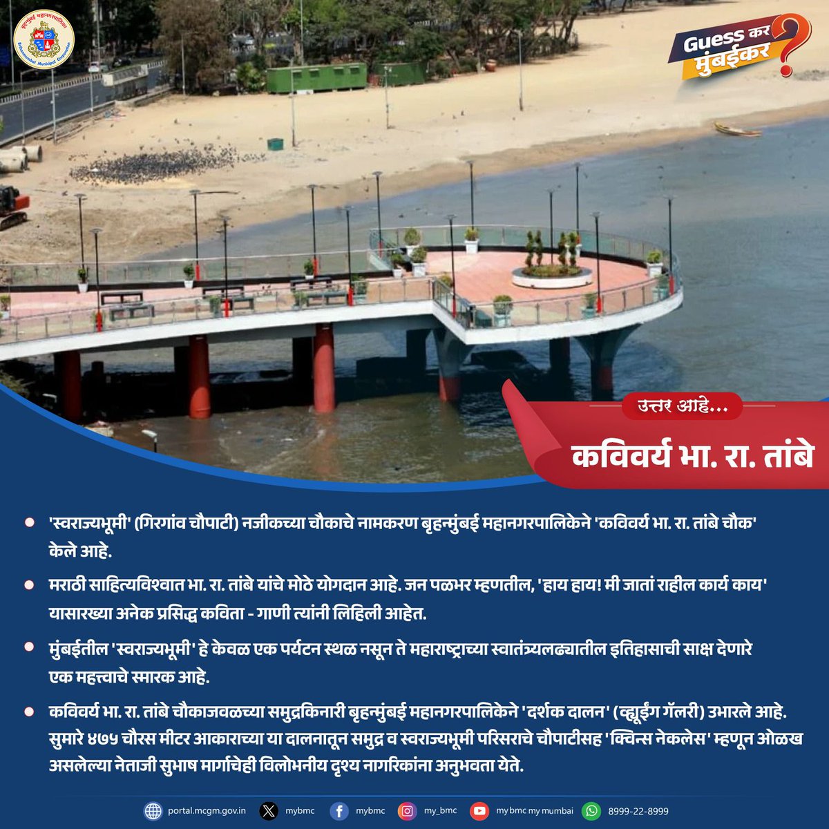 ‘Guess कर मुंबईकर!’ मध्ये काल शनिवारी विचारलेल्या प्रश्नाचं उत्तर आहे, 'कविवर्य भा. रा. तांबे'. आपल्या मुंबईच्या कोणत्या गोष्टी तुम्हाला जाणून घ्यायला आवडतील हे आम्हाला कंमेंट बॉक्समध्ये नक्की सांगा ! "Guess कर मुंबईकर!" मध्ये सहभागी झाल्याबद्दल धन्यवाद! भेटूया पुढच्या