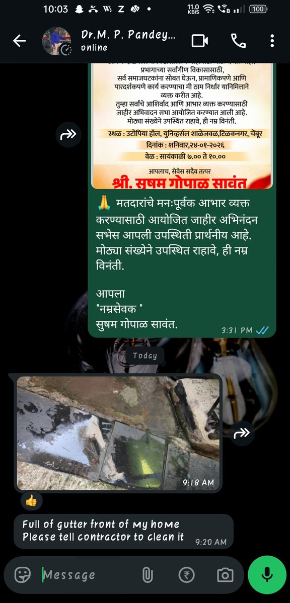 Ward 149 (MWest) – Pestom Sagar, Road No.5 येथे दत्तक वस्ती योजनेअंतर्गत स्वच्छता कामगार नियमित काम करत नाहीत. दर आठवड्याला तक्रारी येत आहेत. गटार तुंबलेले, घाण साचलेली, डास-माशांचा प्रचंड वाढता प्रादुर्भाव — नागरिकांच्या आरोग्याशी खेळ सुरू आहे! तत्काळ कारवाई करावी. @mybmcWardMW
