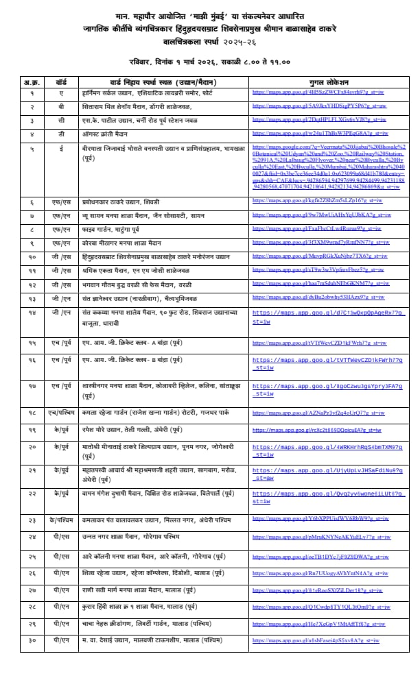 🎨‘बृहन्मुंबई महानगरपालिकेच्या शिक्षण विभागातर्फे' माननीय महापौर आयोजित 'माझी मुंबई' संकल्पनेवर आधारित ‘जागतिक कीर्तीचे व्यंगचित्रकार हिंदुहृदयसम्राट शिवसेनाप्रमुख श्रीमान बाळासाहेब ठाकरे यांच्या जयंतीनिमित्त ‘बालचित्रकला स्पर्धा’ रविवार, दिनांक १ मार्च २०२६ रोजी सकाळी ८ ते ११ या