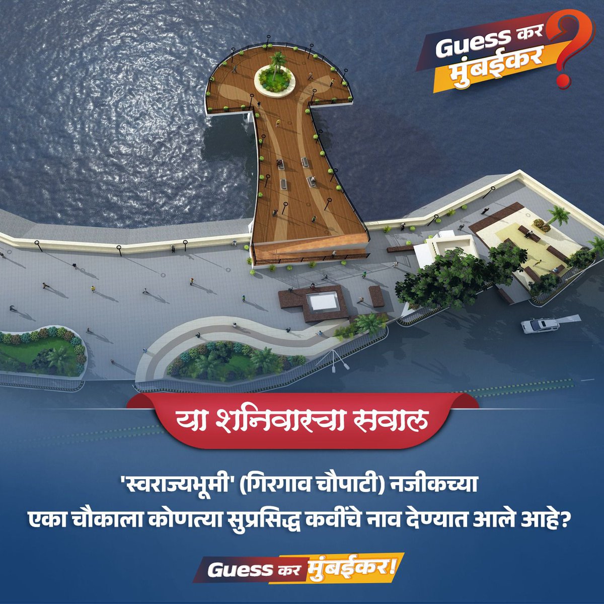 'स्वराज्यभूमी' (गिरगांव चौपाटी) नजीकच्या एका चौकाला कोणत्या सुप्रसिद्ध कवींचे नाव देण्यात आले आहे? या प्रश्नाचं उत्तर तुम्हाला 'कमेंट बॉक्स'मध्ये द्यायचंय. तुम्ही दिलेलं उत्तर बरोबर आहे की नाही, हे आम्ही तुम्हाला रविवारी सकाळी १० वाजता सांगू ! #मुंबई #Mumbai #MyBMC
