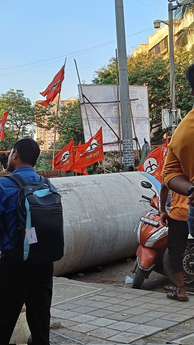 चौकाच्या मध्यभागी फलकबाजी, झेंडे लावले आहेत.... मागचे तीन दिवस हा तमाशा बघतोय... एखाद्याचा जीव गेल्यावर यंत्रणा जागी होणार का? @mybmcWardRN @MTPHereToHelp @MumbaiPolice